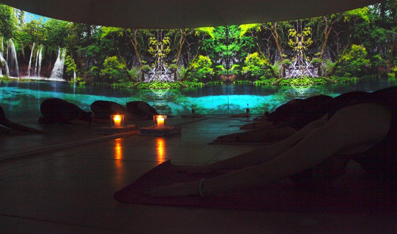 前方のスクリーンに映る映像インストラクターの誘導で進むレッスンです。